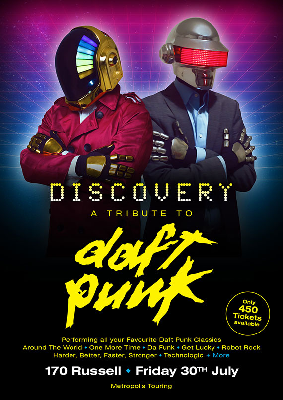 Discovery – Australia’s only Daft Punk Tribute Show! Complete with authentic helmets and custom-made costumes performing Daft Punk classics – Around The World, One More Time, Da Funk, Robot Rock, Technologic, Harder Better Faster Stronger, Aerodynamic + more!
