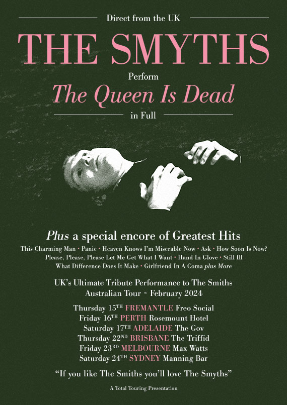 THE SMYTHS (UK) play THE SMITHSThe Queen Is Dead album in Full plus and encore of Greatest Hits – This Charming Man, Panic, Heaven Knows I’m Miserable Now, Ask, How Soon is Now, Hand in Glove, What Difference Does It Make, Still Ill, Girlfriend in a Coma plus more.
