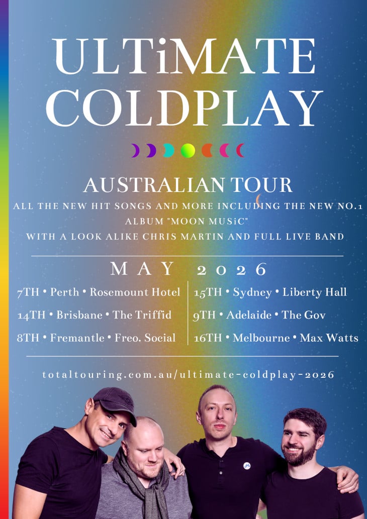 Direct from the UK and for the First Time Ever in Australia – Ultimate Coldplay the world’s most authentic and accurate Coldplay tribute. Fans are treated to a true Coldplay experience, complete with look-alike Chris Martin’s distinctive vocal style and the band’s rich, layered soundscapes and joyous energy.